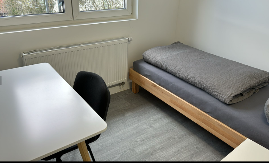 Room with bed (90x200/140x200) incl. bed linen, bedside table, internet up to 1000 mbit, TV, table and chairs, as well as a refrigerator - Bathroom with shower - Toilet and sink - Kitchen with stove, dishwasher, dryer, refrigerator, dishes, cutlery, etc.